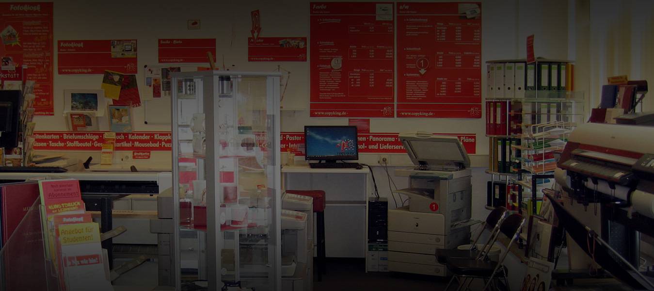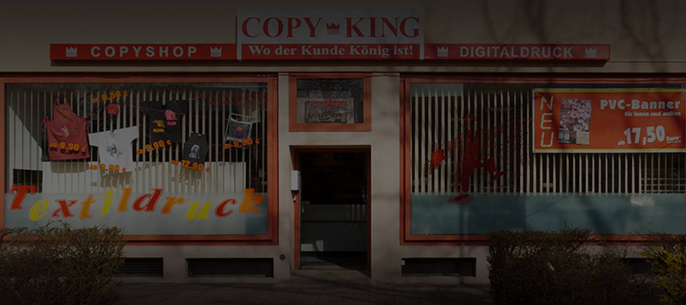 Sie suchen nach einem Copyshop und Druckdienstleister in Berlin, der für exzellenten Service und ein breit gefächertes Dienstleistungsangebot bekannt ist? Bei COPY KING BERLIN sind Sie goldrichtig! Seit 1979 stehen wir unserer Kundschaft mit umfassendem Know-how und erstklassiger Beratung zur Seite. Ob Sie einen kompetenten Ansprechpartner für Poster- und Kalenderdruck benötigen oder hochwertigen Textildruck wünschen, in Berlin ist COPY KING Ihre Top-Adresse! Mit unseren Hochleistungs-Digitaldruckern erstellen wir für Sie unter anderem Flyer, Broschüren, Visitenkarten, Jahresplaner, Dissertationen, Banner, Abi-Bücher, Schülerzeitungen und CAD-Prints in kürzester Zeit und in brillanter Qualität. Selbstverständlich sind Sie bei COPY KING BERLIN ebenfalls gut aufgehoben, sollten Sie nach einem Fachmann für Kalenderdruck in Berlin suchen. Sie möchten Textilien wie T-Shirts, Baseballcaps oder Stofftaschen bedrucken lassen? Dann nutzen Sie unseren Textildruck in Berlin-Steglitz! Überdies gehören wir auch in puncto Posterdruck in Berlin zu den führenden Anbietern in der gesamten Region.
